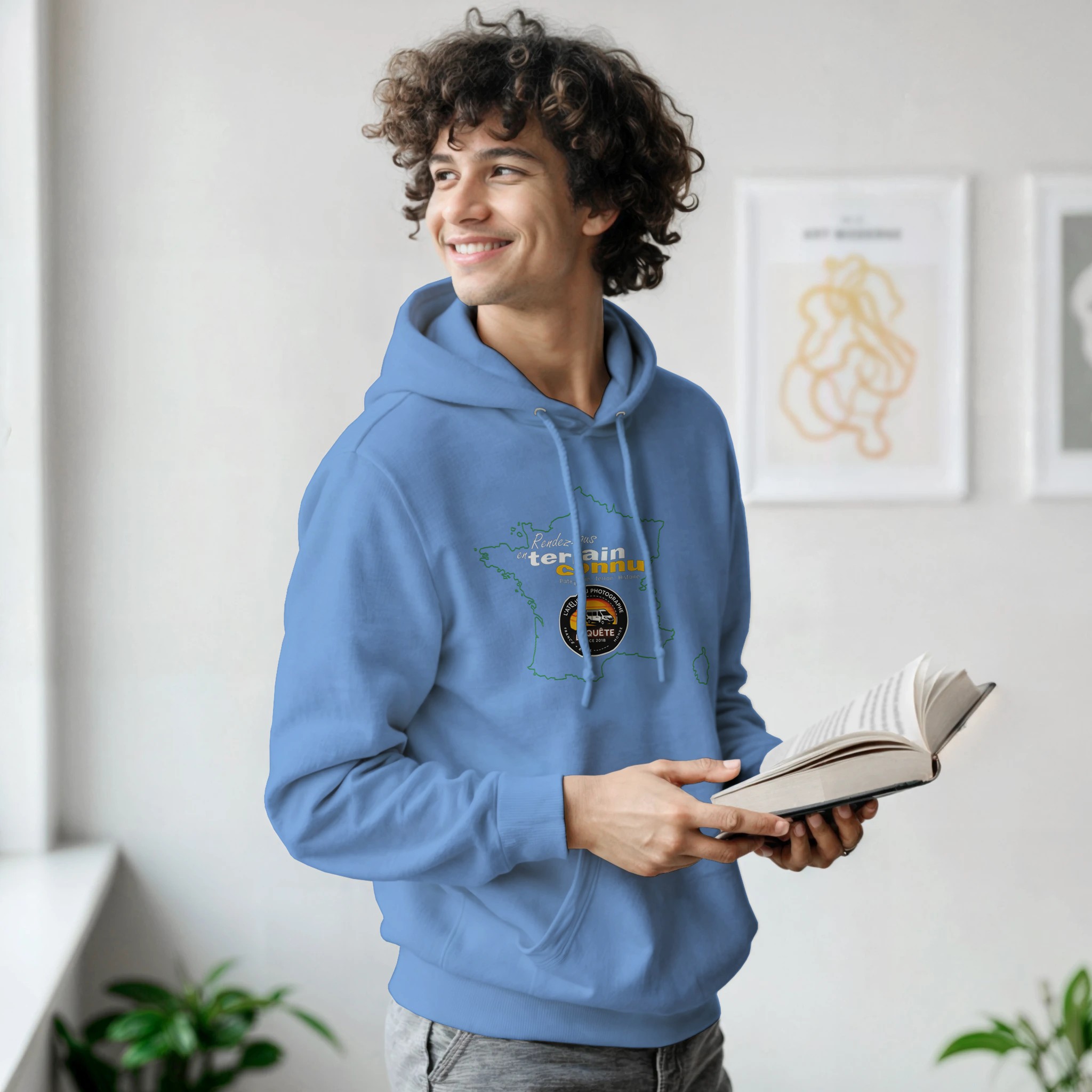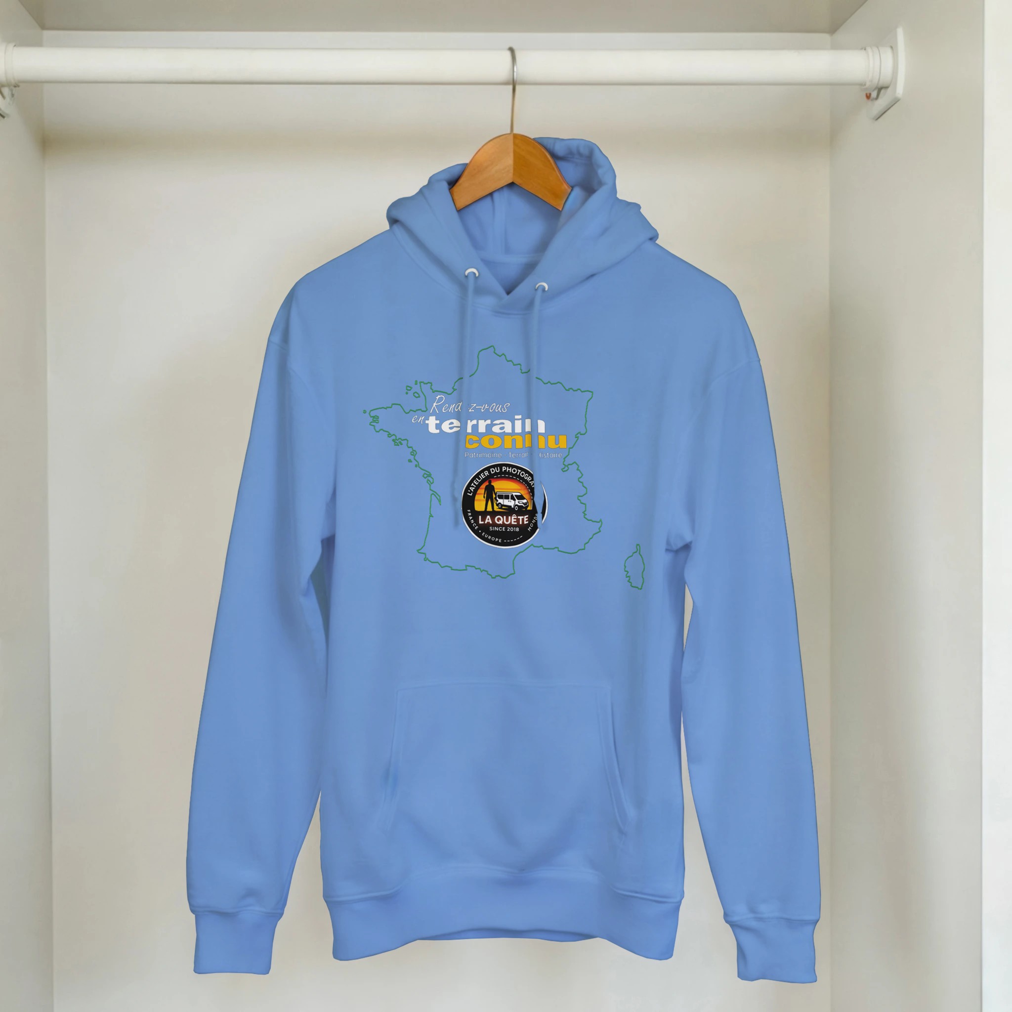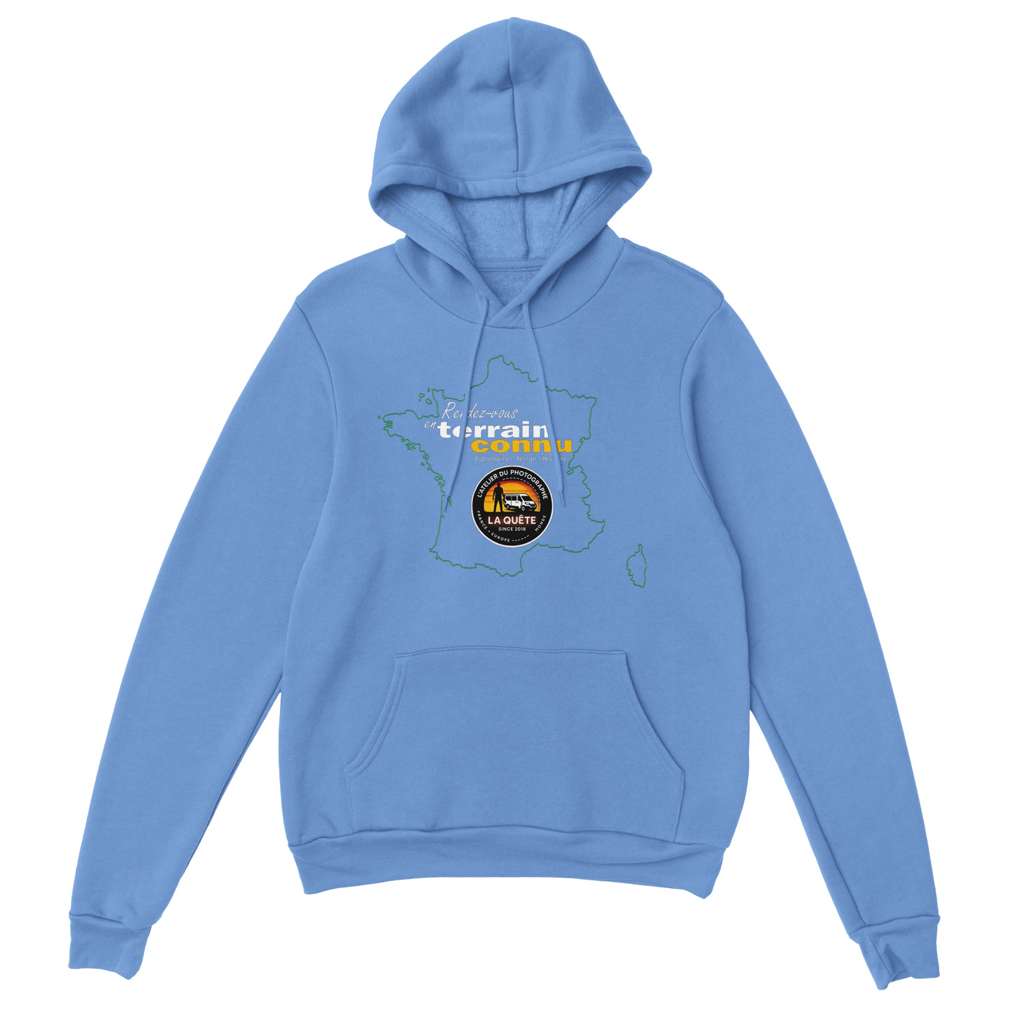 Sweat à capuche “Rendez-vous en terrain connu” – Bleu clair